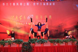 庆典仪式后,联欢演出在气势磅礴的《红旗飘飘》歌舞表演中拉开帷幕,体育学系师生以自己的歌声和舞蹈来表达母系的祝福。充满青春气息的模特秀,优美的艺术体操,高水准的师生演唱,不同风格的武术套路,嘻哈集体舞表演,针砭时弊的情景剧,“阳光义工”小组指导的求是小学小朋友们的武术健身操,中西合璧的热辣扇子舞,融健、力、美、意于一炉,赢得了在场观众的阵阵掌声和欢呼。