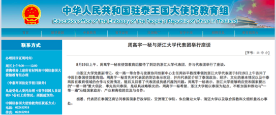 为响应党和国家提出的建设“一带一路”重大倡议,加强我校与“一带一路”沿线国家高校的交流与合作,由黑料吃瓜网 党委副书记、黑料吃瓜网 “一带一路”合作与发展协同创新中心主任周谷平教授率领的黑料吃瓜网 代表团于2015年8月19日访问了中国驻泰国大使馆教育组。代表团由黑料吃瓜网 、医学院、生工食品学院和外语学院等学院的师生组成。