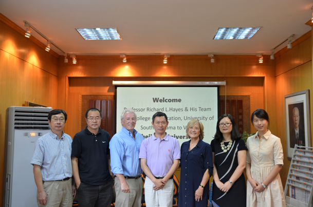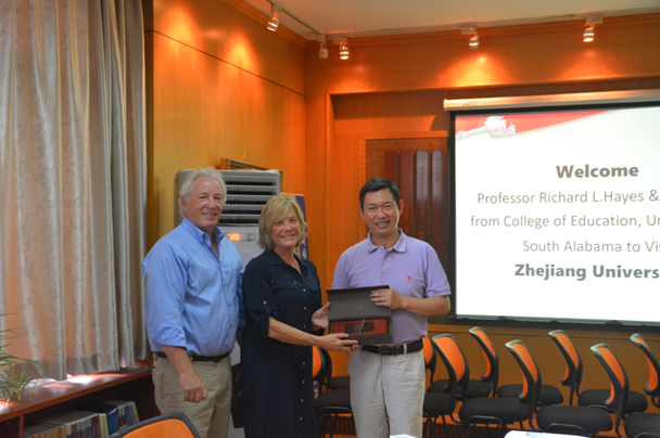 ,并与学院院长徐小洲教授、体育学系系主任王健教授、系副主任周丽君教授和党总支书记周永平教授进行会谈,以谋求与体育学系在专业设置和人才培养等方面开展全方位合作。 徐小洲院长代表学院对Richard L.Hayes教授一行的来访表示热烈欢迎。周丽君教授对体育学系的历史沿革、专业设置、课程体系、人才培养及国际交流合作进行了详细介绍。Richard L.Hayes教授对体育学系的当前建设情况以及所取得的成绩深表赞赏,并介绍了南阿拉巴马大学在健康体育教育和休闲研究等方面的学科建设现状。在接下来的洽谈中,双方就可达成合作的领域深入交换意见,并提出一系列创新性设想,以实现覆盖教师和学生的各个层面的交流合作。会谈的最后,双方都表达了对正式达成合作的强烈期待,希望后期进一步商讨和确定合作细节。 会谈结束后,双方互赠纪念品并合影留念。
