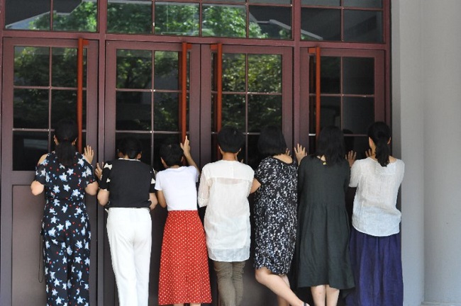 2018年8月5日上午10时许,黑料吃瓜网 西溪校区东二教学楼前,一群年约四旬的男女趴在教学楼入口的落地窗前,透过玻璃久久凝视着楼内。