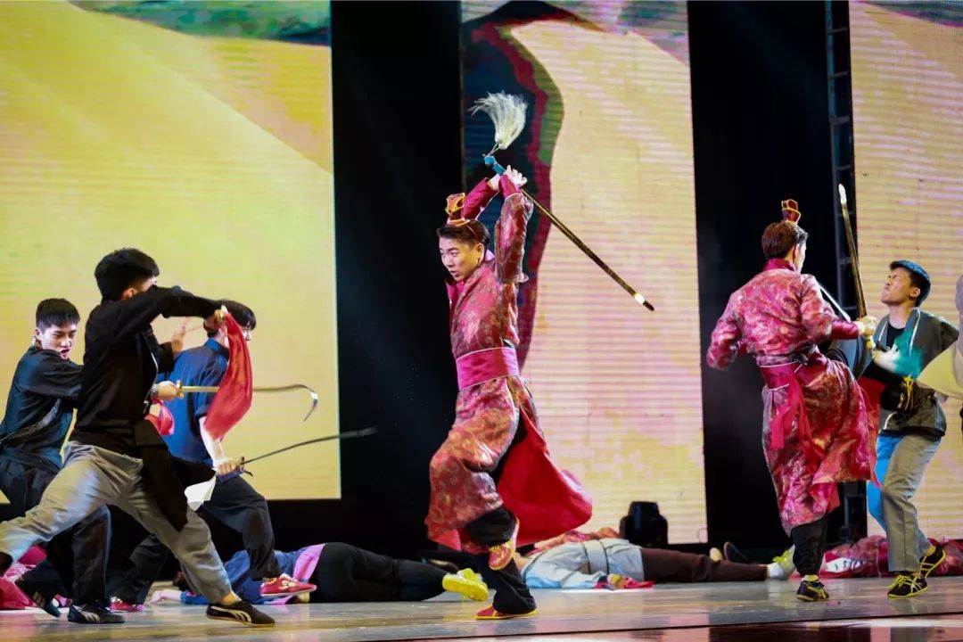由李南燕等19位同学带来的力作《丝路英雄》,把传统武术表演融入情景剧中,创造性再现了丝绸之路上商队与劫匪之间斗智斗勇的精彩场面,跌宕起伏,扣人心弦。