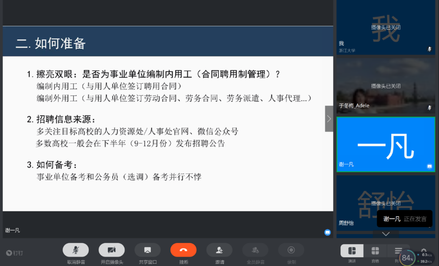 第三位是2019届课程与教学论专业硕士生谢一凡学姐,现任于湖南大学人力资源处,属高校管理职员。通过岗位介绍、招聘备考、就业心得等多方面分享,并尝试对比管理职员和辅导员岗位,谢一凡学姐让同学们对高校行政岗有了更清晰的认知。