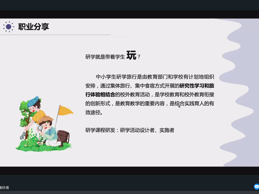 最后是2019届教育学原理专业硕士生褚欣维学姐,现为海亮教育研究院研学课程研究员。学姐一方面讲述了自己的求职与工作经验,另一方面也介绍了海亮教育公司的多类工作岗位,让同学对如何选择职业与工作单位有了更清晰的认识。