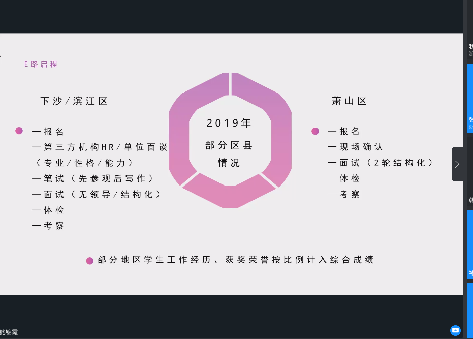 第二位是2019届比较教育学专业硕士生鲍锦霞学姐,现任于中共杭州市萧山区委组织部人才办,负责全区高层次人才引育工作。从“双一流”人才引进谈起,学姐分享了体制内选聘与备考的心得,为大家指明了一条新的就业路径。