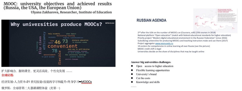 HSE教育研究院的Ulyana Zakharova研究员指出,MOOC的开展是一项全球议程,经济的发展、人力资本的投入、21世纪技术和能力的需求和终身学习等趋势共同带来了这种大规模的开放网络课程。此外,她还在讲座中以俄罗斯、美国和欧盟为例,比较了这三个国家开展MOOC学习的目标与取得成就。