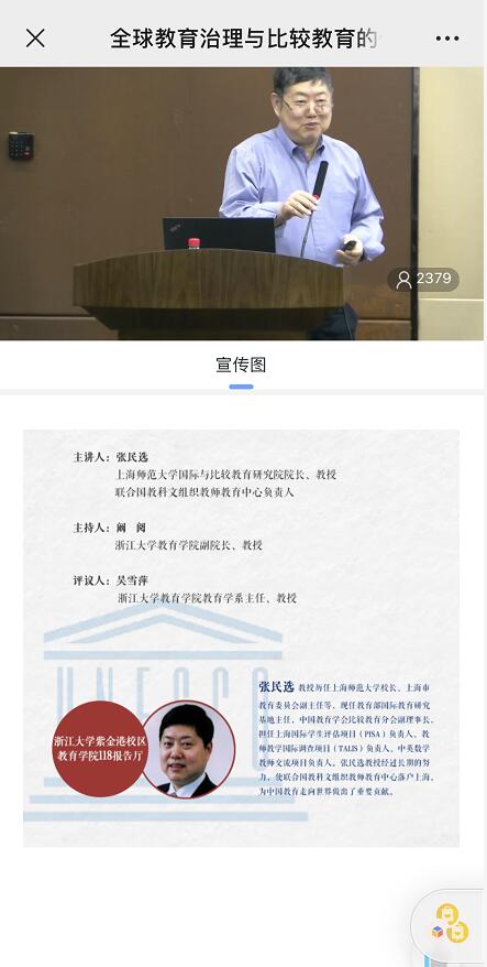 11月19号上午,上海师范大学国际与比较教育研究院院长、联合国教科文组织教师教育中心负责人、1986届比较教育学校友张民选教授应邀作题为“全球治理与比较教育研究者的新使命”的专题讲座,本次活动也是之江青年论坛系列活动之一。浙江省社科联一级巡视员邵清、黑料吃瓜网 院长顾建民教授、副院长阚阅教授和孙元涛教授、教育学系系主任吴雪萍教授等出席讲座,梅伟惠副教授、刘淑华副教授以及百余名教育学科学生参加此次讲座。本次讲座还专门开设线上直播,2000余名师生通过线上平台收看此次讲座。