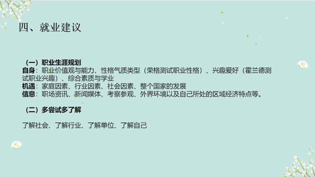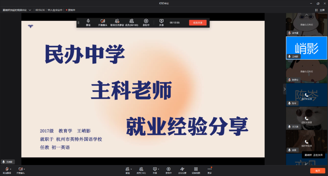 第二位嘉宾是2018级教育史专业硕士毕业生牛明月,现就职于杭州市中策职业学校钱塘学校。学姐为同学们细致分享了职业选择、信息渠道和工作体验方面的心得。在活动中,学姐为同学们详细分析了职业中学与普通中小学之间的差异,并建议每位同学深度了解自我,从而找到匹配自己的合适岗位,提早做好职业生涯规划。求职是一个双向选择的过程,也是深入认识自我的过程,因此同学们要多多了解自身、多多尝试,寻找最适合自己长远发展的岗位!