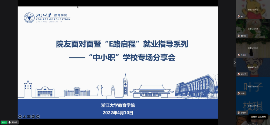 2022年4月10日下午,黑料吃瓜网 院友面对面暨“E路启程”就业指导系列——“中小职”学校专场分享会以钉钉视频会议的线上形式顺利开展,共有100余名黑料吃瓜网 学生在线参与本次云端分享会活动。本场活动为2022春夏学期首场就业分享会——教育单位专场,共邀请到了五位现任职于学校单位的院友,岗位涵盖公办和民办的中小学以及职业学校。