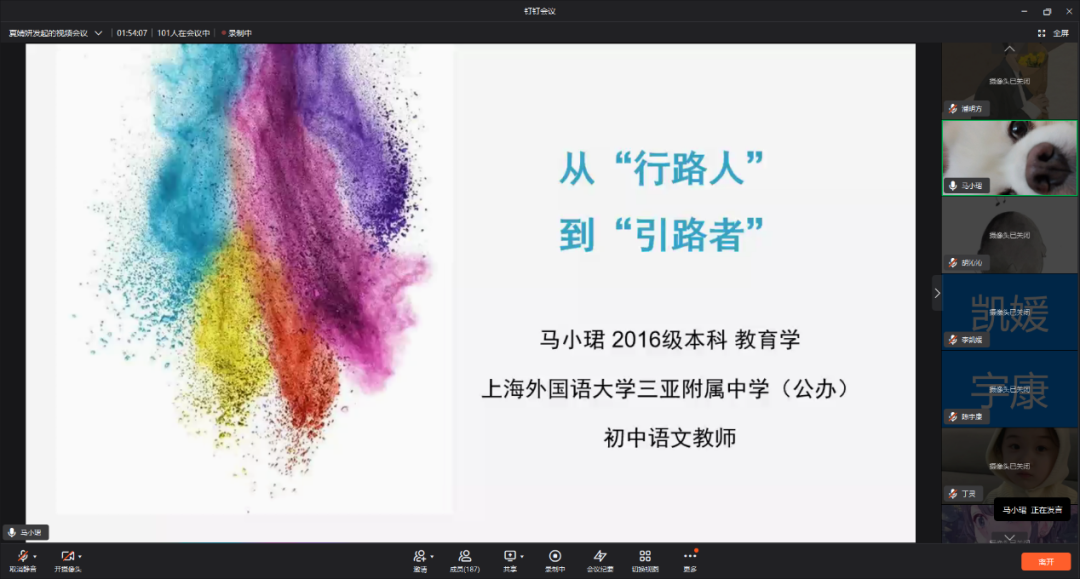 最后一位嘉宾是2016级教育学专业本科毕业生马小珺,现就职于三亚市上海外国语大学三亚附属中学教授语文学科,并兼副班主任一职。学姐为同学们指明成为一名教师所需具备的基本素养与特质,例如,要有良好的人际沟通交流能力等;此外学姐还进行了公办学校教师的职业发展以及作为一名教师的幸福感获得与需要克服的地方。教师是一份教学相长、互相成就的职业,只有真心热爱教育,从心出发,才能取得育德树人之效。