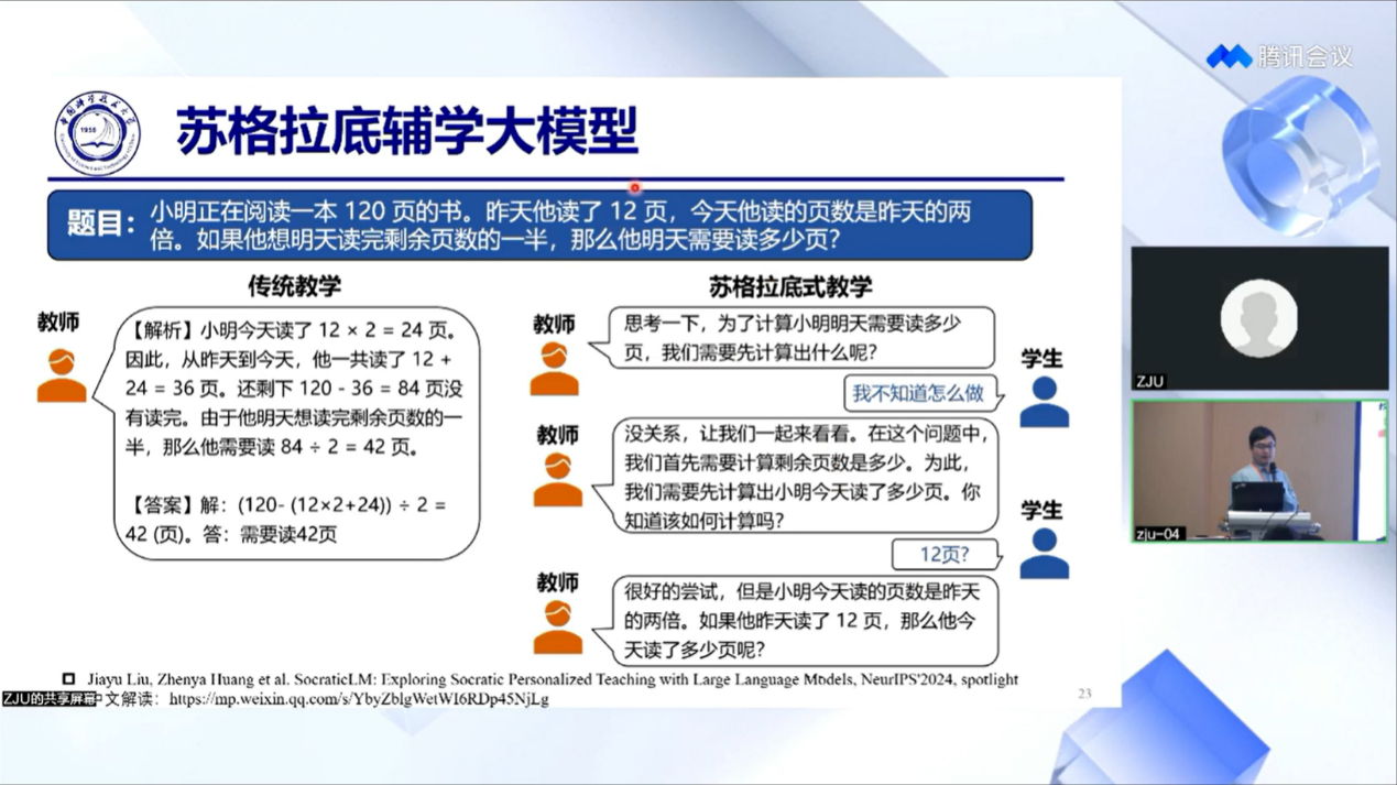 中国工程院院士、同济大学校长郑庆华院士从战略高度出发,强调了教育大模型在智慧教育中的重要地位。他指出,教育大模型是智慧教育的三大基础设施之一,是通向教育现代化的关键基石。郑庆华院士以同济大学自主研制的土木学科知识大模型为例,阐述了教育大模型的关键技术。此外,郑庆华校长也强调了AI4S、AI4E在拔尖创新人才培养中的重要作用,并分享了人工智能在“招-教-学-评-管-服”全链条中的应用探索。