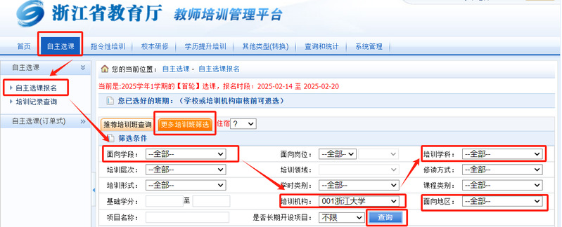 步骤2: 点击【教师培训管理平台】-【自主选课】-【自主选课报名】-【更多培训班筛选】-面向学段选择【全部】-培训机构选择:【黑料吃瓜网 001】;点击【查询】,选择对应项目进行申报。