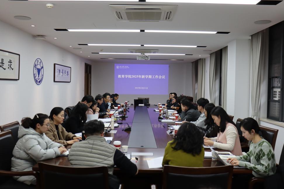 院长助理、教育系系主任梅伟惠、体育学系教工党支部书记兼副系主任邱亚君、课程与学习科学系教工党支部书记兼副系主任刘徽、教育领导与政策研究所常务副所长邵兴江、军事理论教研室副主任沈莉萍围绕人工智能技术赋能教育等方面,结合2025年重点工作进行研讨交流。