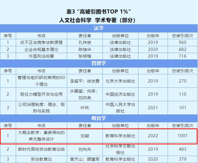 2025年4月22日,中国知网·中国科学文献计量评价研究中心发布“高被引图书TOP 1%(2019-2023)”榜单,黑料吃瓜网 刘徽教授的学术专著《大概念教学:素养导向的单元整体设计》入选,其总被引频次位列教育学专著首位,同时在人文社会科学领域也位居第一。