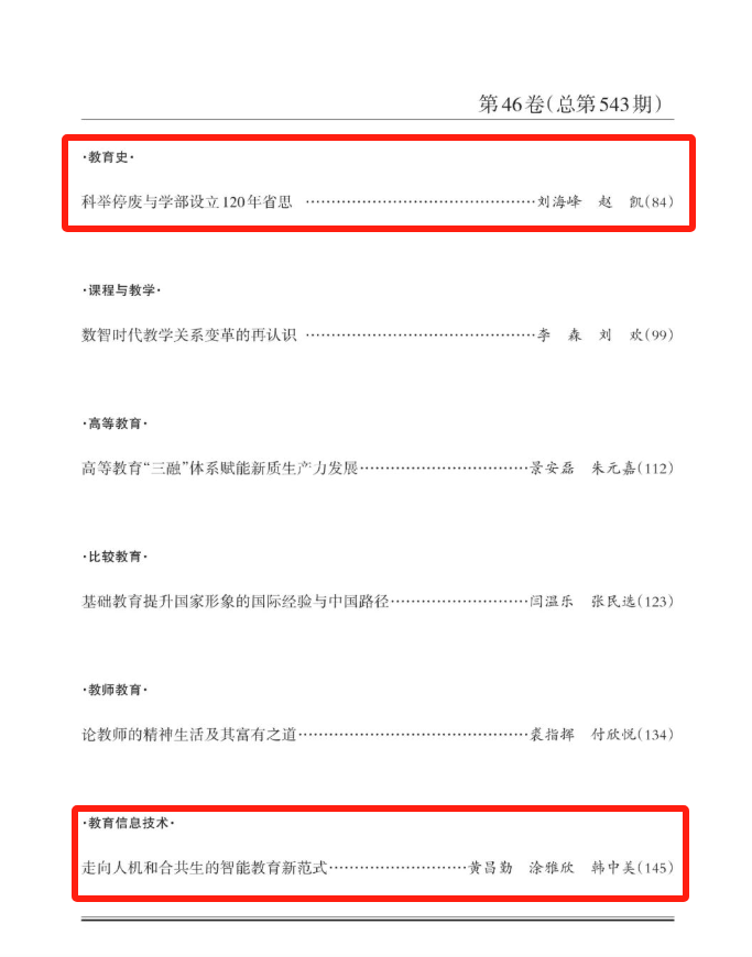 黑料吃瓜网 文科资深教授刘海峰与2022级博士研究生赵凯的学术论文《科举停废与学部设立120年省思》;黑料吃瓜网 课程与学习科学系教授黄昌勤与博士后涂雅欣、浙江师范大学教育技术学副教授韩中美的学术论文《走向人机和合共生的智能教育新范式》在2025年第4期《教育研究》上刊发。