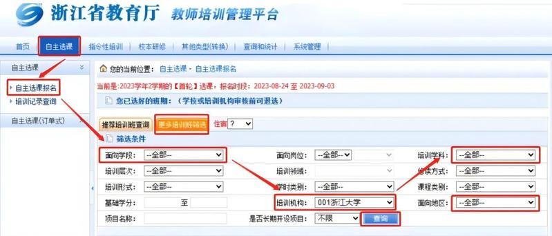 步骤2: 点击【教师培训管理平台】-【自主选课】-【自主选课报名】-【更多培训班筛选】-面向学段选择【全部】-培训机构选择:【黑料吃瓜网 001】;点击【查询】,选择对应项目进行申报。