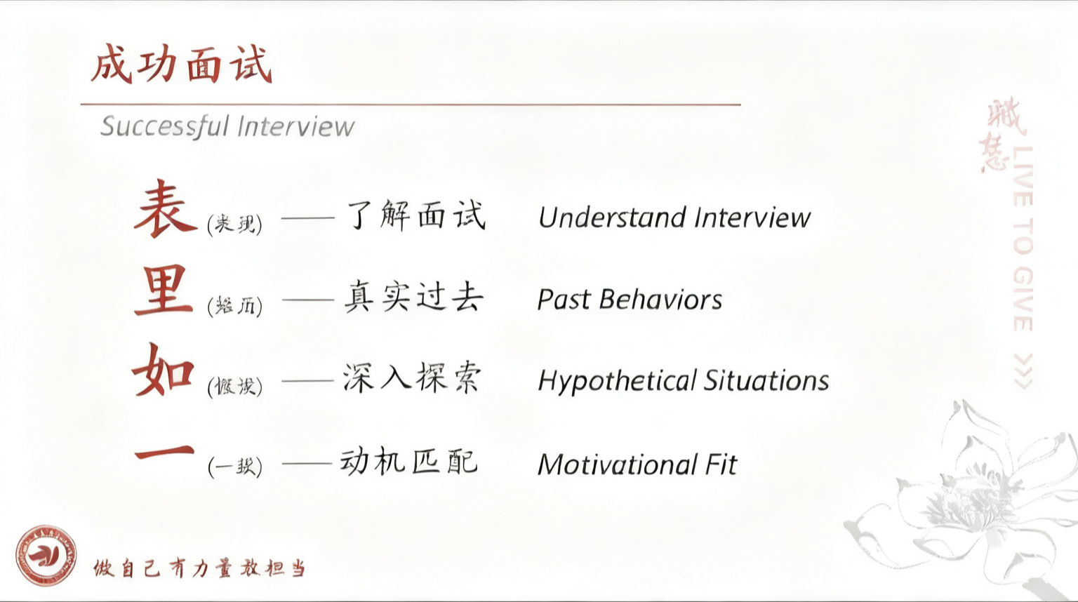 王老师首先明确学校与职场的“分水岭”,强调相较于学校的偏重学业表现,职场更看重综合能力。他引导同学们从面试官的角度,思考一场成功面试是什么样的,随后从“表里如一”四个方面深入剖析成功面试的核心要素。