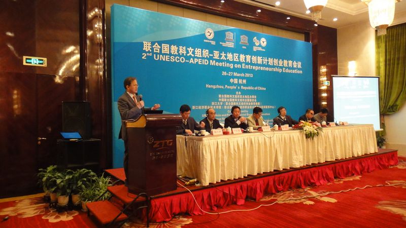 The 2nd UNESCO-APEID meeting on Entrepreneurship Education was held in Hangzhou on March 26 and 27, 2013. The meeting was co-organized by UNESCO Asia and the Pacific Regional Bureau for Education, the Chinese National Commission for UNESCO, the UNESCO Chair in Entrepreneurship Education at Zhejiang University and the Zhejiang Technical Institute of Economics. Representatives from UNESCO Bangkok and the World Bank Indonesia, and participants from 11 Asian and Pacific countries discussed and communicated on the topic of “the responsibility of stakeholders in entrepreneurship education”, “principles of sustainable entrepreneurship education” and “elements of entrepreneurship education in Asia and the Pacific”. As one of the key outcomes, an Entrepreneurship Education Net (EE-Net) was formulated and launched at this meeting.