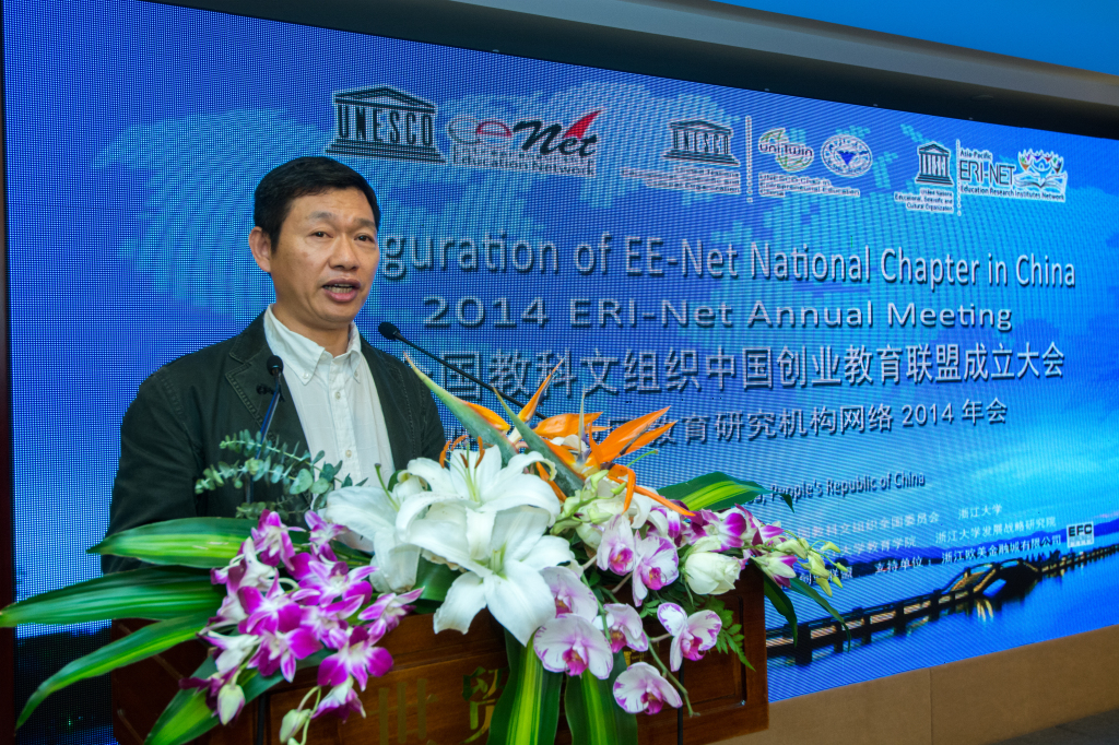 Inauguration of the UNESCO Entrepreneurship Education-Network (EE-Net) National Chapter in China and the 2O14 Education Research Institute-Network (ERI-Net) Annual Meeting was held from 25th to 28th, Nov. 2014 at Zhejiang Narada Grand Hotel. This conference was sponsored by the UNESCO Asia-Pacific Regional Bureau for Education, Chinese National Commission for UNESCO, and Zhejiang University (ZJU), and held by the UNESCO Chair in Entrepreneurship Education at ZJU, College of Education in ZJU, and the Research Institute of Development Strategy in ZJU. The conference had two topics for discussion: one was the inauguration of the EE-Net National Chapter in China and the construction of its platform; the other was the international comparison of evaluation and employment system of academic staff in higher education institutes. This conference was aimed at enhancing communication and cooperation among countries in the Asian-Pacific Region on entrepreneurship education and academic evaluation under the framework of UNESCO.
