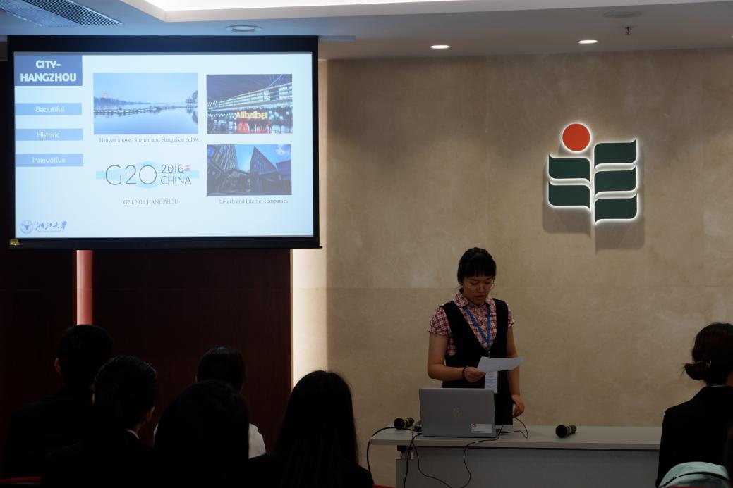 We also prepared the introduction about us for the teachers and students of EduHK. First, Wang Feifan, a junior student from College of Education, introduced the beautiful city Hangzhou from the aspects of history, culture, natural scenery, tea specialties, etc.