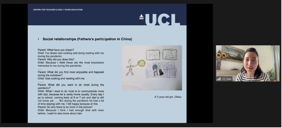 In the seventh session, Dr. Kate Hoskins of Brunel University, UK, gave a lecture on “Me, My Child and COVID-19: Parents' reflections on their child's experiences of lockdown in the United Kingdom (UK) and China”. Based on her own experience, Dr. Hoskins asked children to draw their experiences and impressions of COVID-19 with coresearchers (parents). This study fills the research gap on young children's perspectives and psychological processes in the context of COVID-19. The lecture showed great humanity, which helped us see children's unique and thought-provoking experiences under the COVID-19 pandemic.