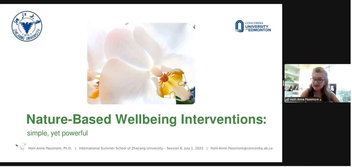 In the fifth session, Dr. Holli-Anne Passmore from Concordia University of Edmonton gave a lecture on “Nature-based wellbeing interventions: Simple, yet powerful”. Dr. Passmore firstly explained “why nature can impact on us” based on research results, and clarified Eco-existential Positive Psychology(E-EEP) framework, which includes elements like identity, death, isolation, freedom and meaning. She emphasized that it is the quality not quantity of the time spent in nature that does matter. Next, Dr. Passmore introduced the Character Strengths in Nature (CSiN), Three Good Thigs in Nature(3GTiN) as well as Noticing Nature Intervention (NNI). According to research on NNI, those who are exposed in nature are much happier, more satisfied with life, have greater feelings of elevation, and feel more connected and less stressed.