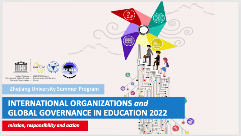 In order to better serve the national strategy of opening up to the outside world and help cultivate high-quality talents who can work in international organizations and have international competence, as a support program for the 2022 Zhejiang University Graduate International Summer School and International Workshop, organized by the UNESCO Research Center of Zhejiang University, the APEID Linkage Center of UNESCO Zhejiang University and the UNESCO Chair of Entrepreneurship at Zhejiang University Education Chair, organized with the support of UNESCO (United Nations Educational, Scientific and Cultural Organization) and other institutions, the 2022 Zhejiang University International Organizations and Global Education Governance Summer Online Camp started successfully. Under the epidemic, teachers and students met in the cloud through the online ZOOM platform to discuss the cultivation of talents in international organizations. A total of 25 students participated in this event, including a total of 8 master students and 8 doctoral students.